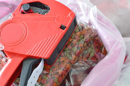 Closeup female hands sticking label on plastic package pasta. Storage organization of food products