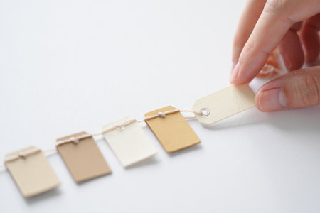 Tags organization. Craft strings retail. Arranging set of tags pricing.