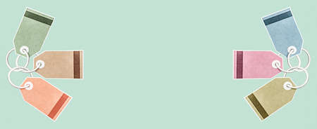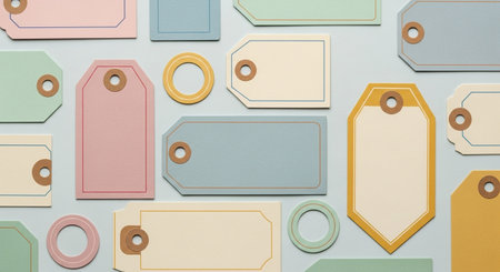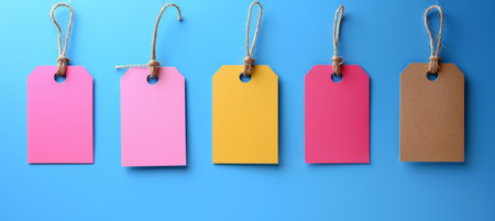 showing five colorful hanging price tags in pastel shades of green, blue, pink, and yellow with white blank...