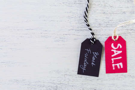 Black Friday sale, discount, outlet concept. Red label tags with sign SALE and % on white background. Flat lay, top view.
