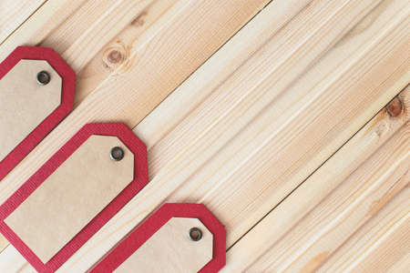 Recycled craft paper red tags in a row on vintage wooden table background with free copy space. Top view. Mock up sample.