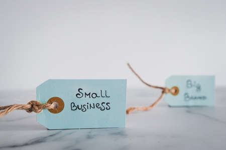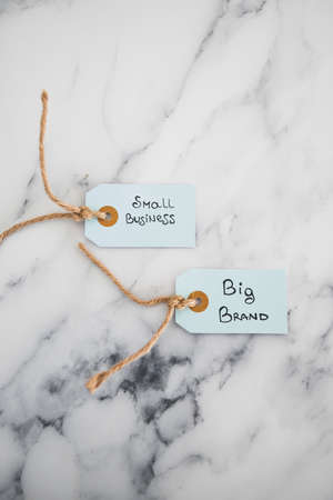 product tags with small business vs big brand texts side by side sho at shallow depth of field, concept of customer behaviour and supporting small businesses