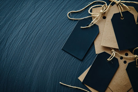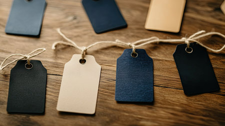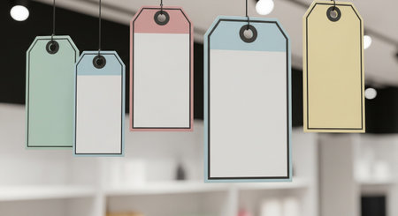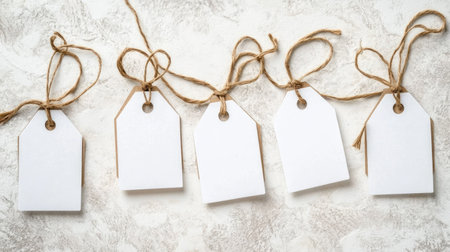 Blank price tags hang gracefully on a string against a softly blurred background in a store, ready for personalization.