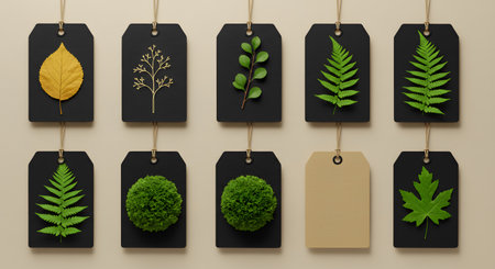 A beautiful arrangement of rustic brown tags with twine and greenery on a wooden table, perfect for labeling, crafting, or decoration in various projects.