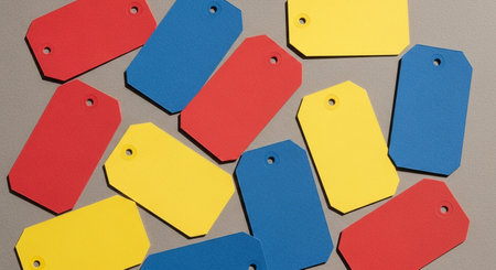 A collection of red, blue, and yellow rectangular paper tags with holes are scattered across a gray surface.