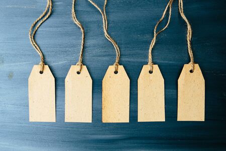 Five brown blank paper price tags or labels set hanging on a rope on the blue wooden background.
