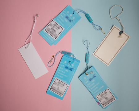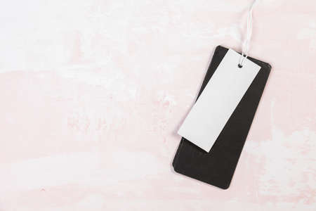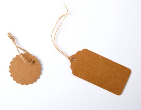Cardboard and paper price tags on a white background. Copy space, mock up