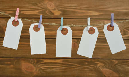 Set of colorful blank hang tag on wooden background. Ready for your text.