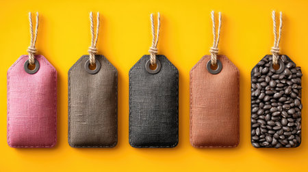 Collection of five faux leather tags in different colors and textures, set against a bright yellow backdrop, suitable for crafts and creative branding.