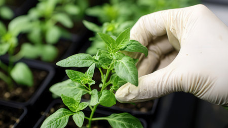 Young green seedlings are thriving in a laboratory beaker as a scientist in blue gloves closely observes their growth, showcasing research in plant biology.