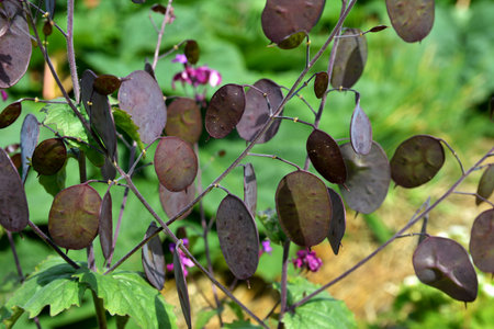 Lunaria annua - annual honesty. Ornamental pods of lunaria in spring.Green lunaria plant in the garden. The second year of the plant's development. Lunaria flowers and fruits.