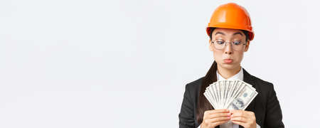 Impressed and pleased female asian construction inspector, industrial architect receiving big bribe, counting money and looking astonished with sum, standing in safety helmet and suit