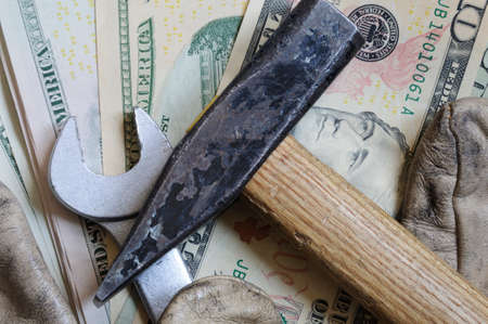Work Tools lying with money symbolizes payment for work done, working wage , repair costs. Isolated on white
