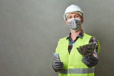 Construction worker counting money. Repairman with dollar bills. Industrial worker salary concept