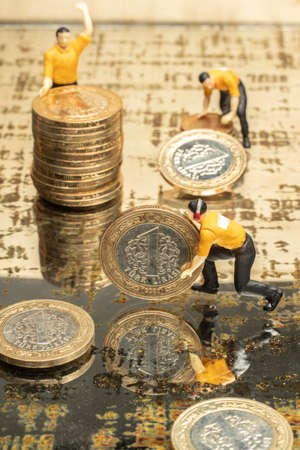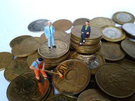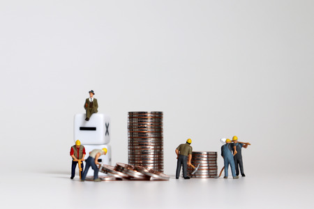 Business concept with coins and miniature people. A miniature man carrying coins in a cart and a miniature man standing on a pile of coins.