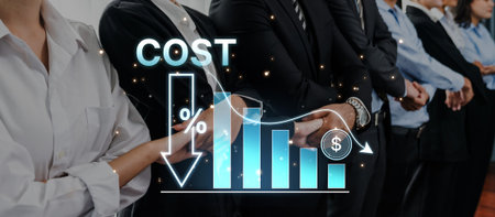 Business professionals engage in strategic discussion about financial planning, illustrated by a downward cost trend and blue bar charts in a modern office environment.