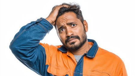 Thoughtful Indian man in orange workwear, hand on head, stands against a white background, expressing contemplation and the challenges of his work environment