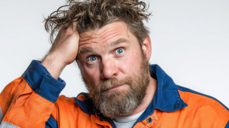 Male worker in an orange and blue jacket displays a surprised expression, highlighting a moment of confusion against a bright, minimal background, capturing a relatable emotion