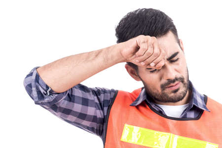 Young asian civil engineer helmet hard hat standing and headache hands rubbing eyes feeling depressed on isolated white background. Mechanic service concept.