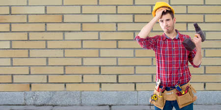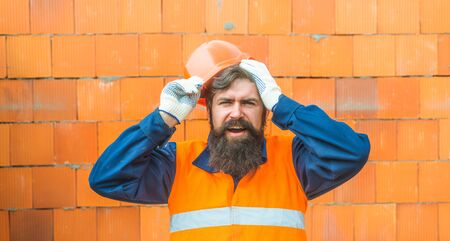 Disappointed Sad Caucasian Contractor Worker Facing. Legal Problems. Bond, Insurance, Work Injury Concept Photo. Bearded builder grabbed his head.