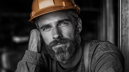 A man with a beard and a hard hat sits in a construction area, resting his chin on his hand while looking directly at the viewer with a serious expression, reflecting on his work life.