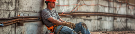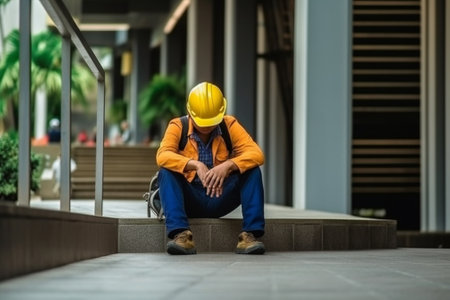 A construction worker wearing a bright yellow hard hat and a weathered yellow jacket sits on the ground with his head in his hands visibly fatigued. His jeans are dirty from the days labor reflecting the hard work he has put in. The backdrop of a rusted blue wall adds to the gritty ambiance of the construction site illustrating the challenges and weariness faced by workers in demanding jobs