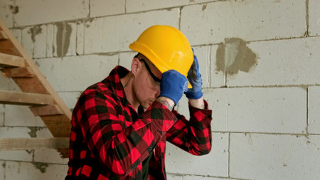 Angry construction worker in helmet facing challenges, stressed and unhappy on the job site.