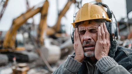 A construction worker with a helmet is visibly stressed from excessive noise at a busy job site, depicting the challenges of a demanding work environment.
