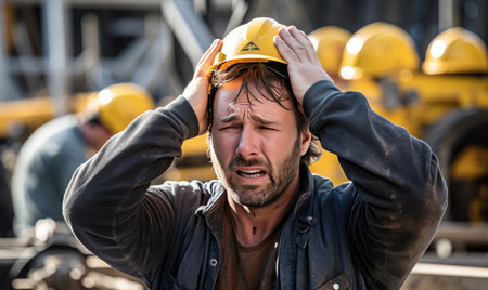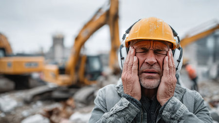 A middle-aged construction worker appears stressed while working on a construction site, wearing a yellow hard hat and experiencing the noise of heavy machinery in the background.