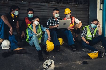 Group of technician or workers sit in front of the door of factory and end of work and they look sad.