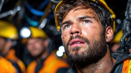 Portrait of a tired worker in a yellow hard hat on a dark background, Generative AI
