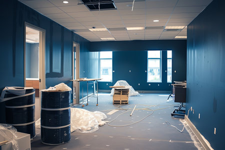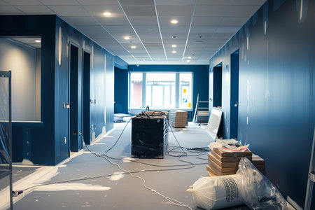 A modern office space in the middle of renovation, featuring new furniture, fresh paint, and updated lighting. The background showcases a functional and stylish work environment.