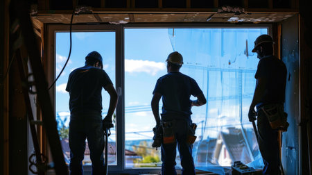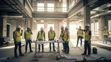 A group of construction workers, wearing safety vests and helmets, are gathered inside an unfinished building. They are reviewing blueprints and discussing the project. The scene is illuminated by natural light from large windows. This image could be useful for illustrating construction, engineering, or teamwork themes, suitable for various editorial or commercial applications.