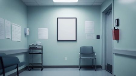 White poster frame on the pale walls of a medical waiting room, with subtle lighting, medical charts, and seating creating a professional setting.