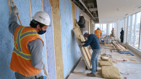 Medium shot of workers installing ecofriendly insulation panels in office walls during a sustainable retrofit project.