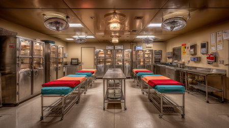 This image showcases a modern medical facility with stainless steel equipment, featuring bright lighting and clean, organized spaces for clinical purposes.