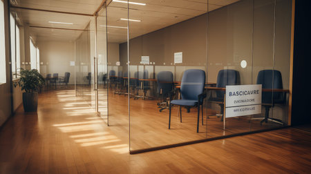An AI generated illustration of This is a well-lit conference room featuring wooden walls and desks set up in an organized fashion