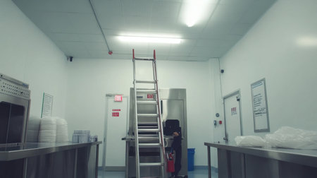 Bright and clean commercial kitchen with a metallic aesthetic, featuring a step ladder, metal cabinets, and cleaning supplies, ideal for professional settings.