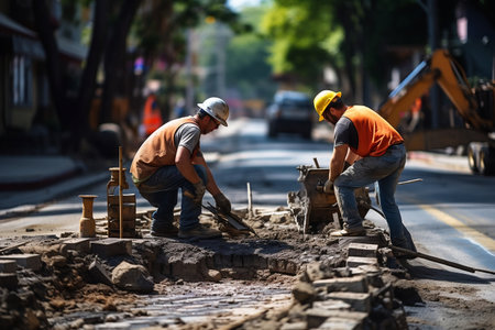 A bustling construction site featuring heavy equipment and workers actively engaged in digging and building in an urban environment. Safety gear is prominent.
