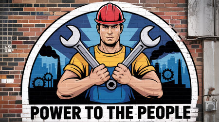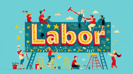 Workers of different professions building a giant Labor Day sign together, using tools like hammers, wrenches, and paintbrushes cartoon Vector Illustration Generative AI