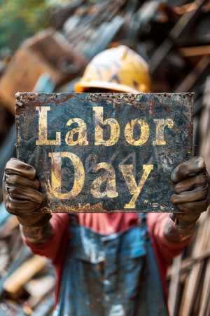 A worker in overalls and a hard hat holds a rusty sign that reads Labor Day in front of a pile of scrap metal.