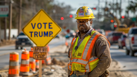 African American construction worker wearing reflective vest and helmet standing at road sign.