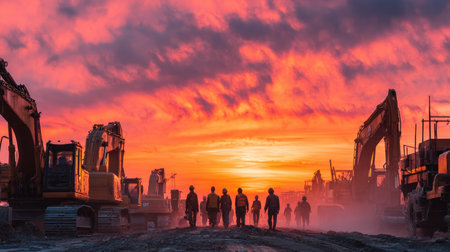 Dynamic scene of silhouetted construction workers walking towards a stunning sunset, framed by heavy machinery and vibrant sky, highlighting workforce unity.
