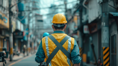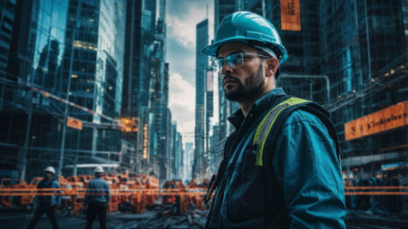 A vigilant construction professional in a bright safety gear surveys ongoing development amid towering cranes and modern cityscape silhouettes, capturing urban growth ene