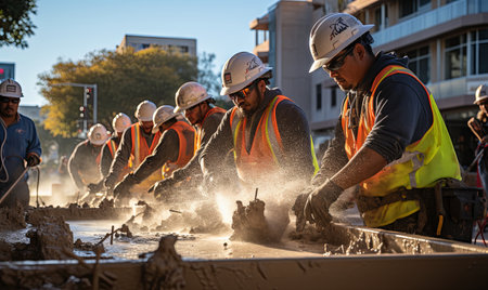 Construction workers wearing hard hats are working together on a cement project at a construction site.