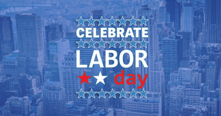 Image of celebrate labor day text over cityscape. labor day and celebration concept digitally generated image.