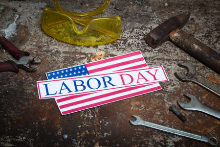 Labor day poster concept backgroun, celebrate labor day in america in september, spare part arrangement on wood background with american flag