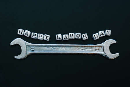 Happy labor day concept greeting card background. Wrench with word happy labour day on blackboard background.