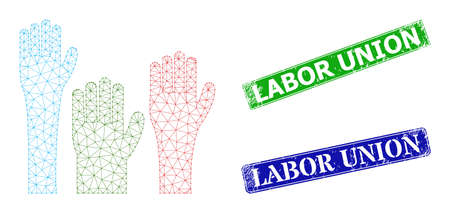 Triangular voting hands image, and Labor Union blue and green rectangular dirty stamp seals. Polygonal carcass illustration is created from voting hands icon.