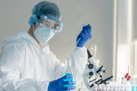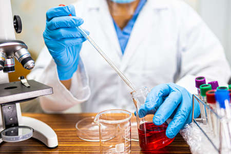 Scientist or medical in lab coat working in biotechnological laboratory equipment for research with mixing reagents in glass flask in clinical laboratory.